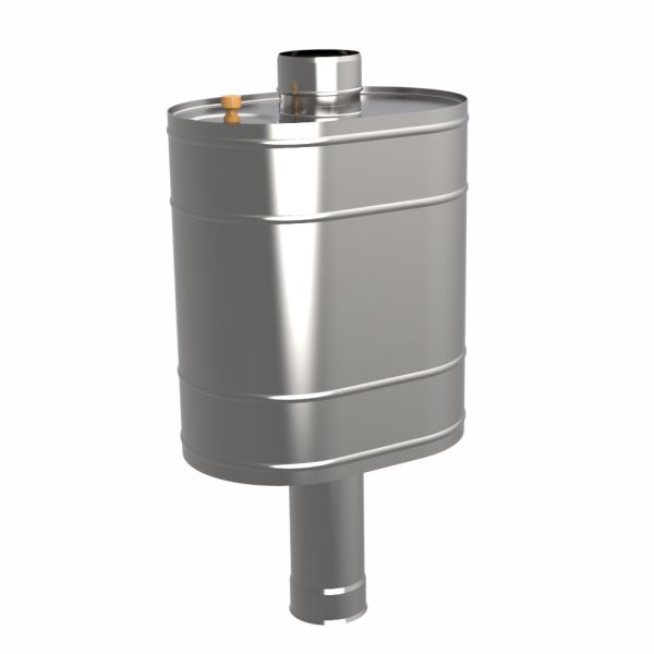 Бак на трубе под каменку объемом 50 л требуется для нагрева и хранения воды, тепло поступает от сжигания твердого топлива. Устанавливается на банную печь со стандартным дымоходным патрубком диаметром ф 115. Емкость с проходящей через нее дымовой трубой выполнена из нержавеющей стали AISI 439/0,8 мм, имеет заливную горловину, на дне штуцер 3/4".
