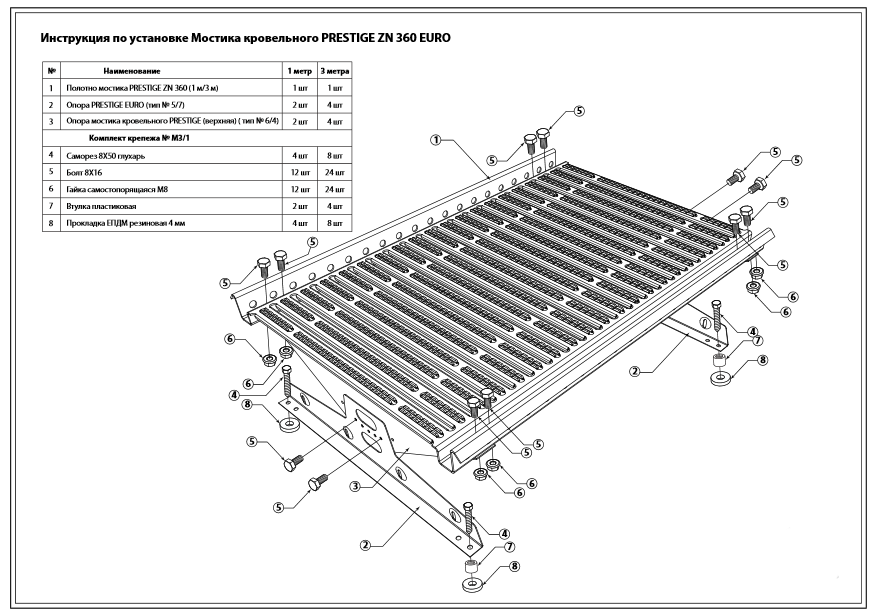 Комплектация: Полотно мостика PRESTIGE 360/1,2 м ( 1 шт), Опора PRESTIGE NEXT ( 2 шт), Опора мостика кровельного PRESTIGE (верхняя) ( 2 шт).